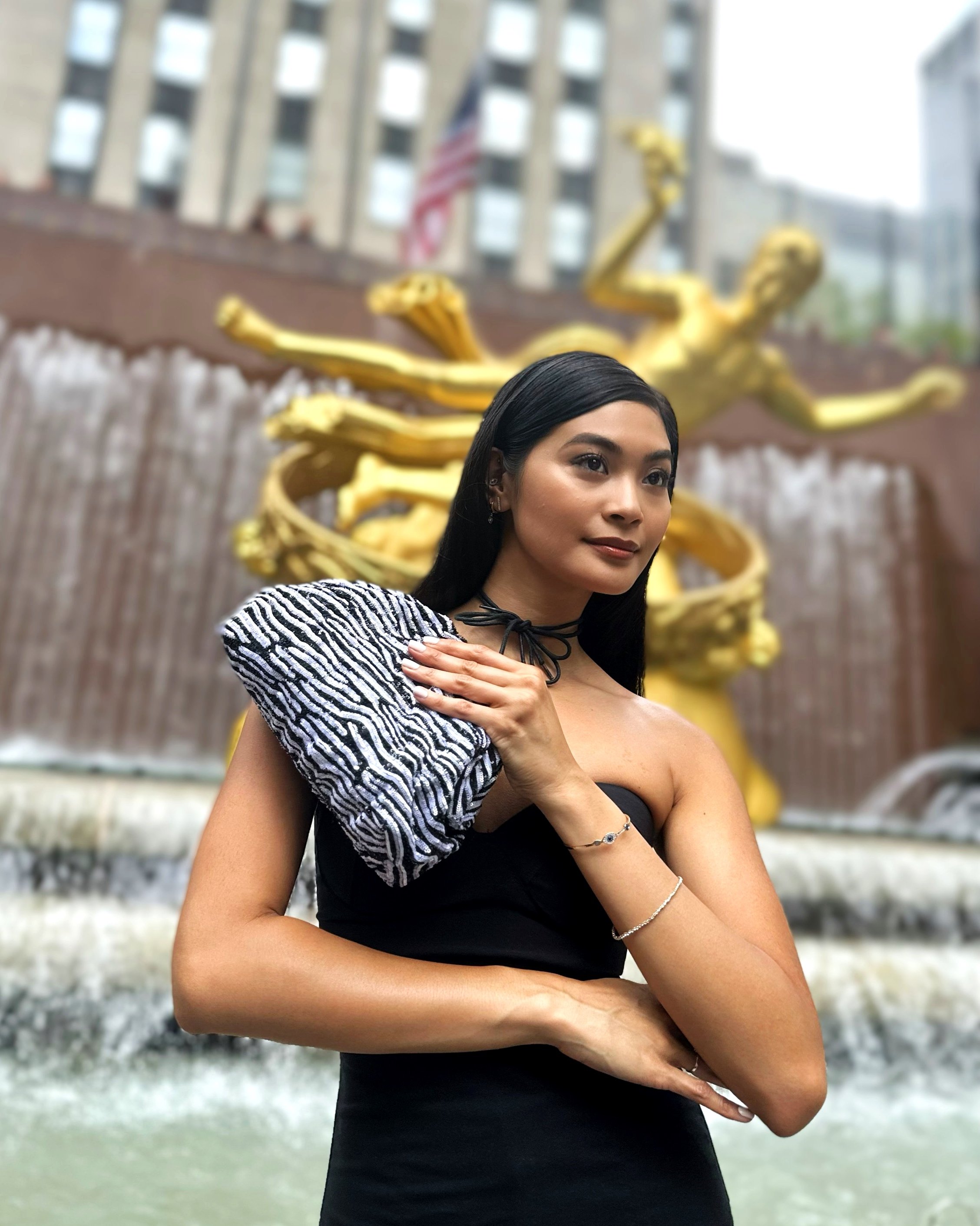 Aya with her Aya frame clutch at Rockefeller Center.