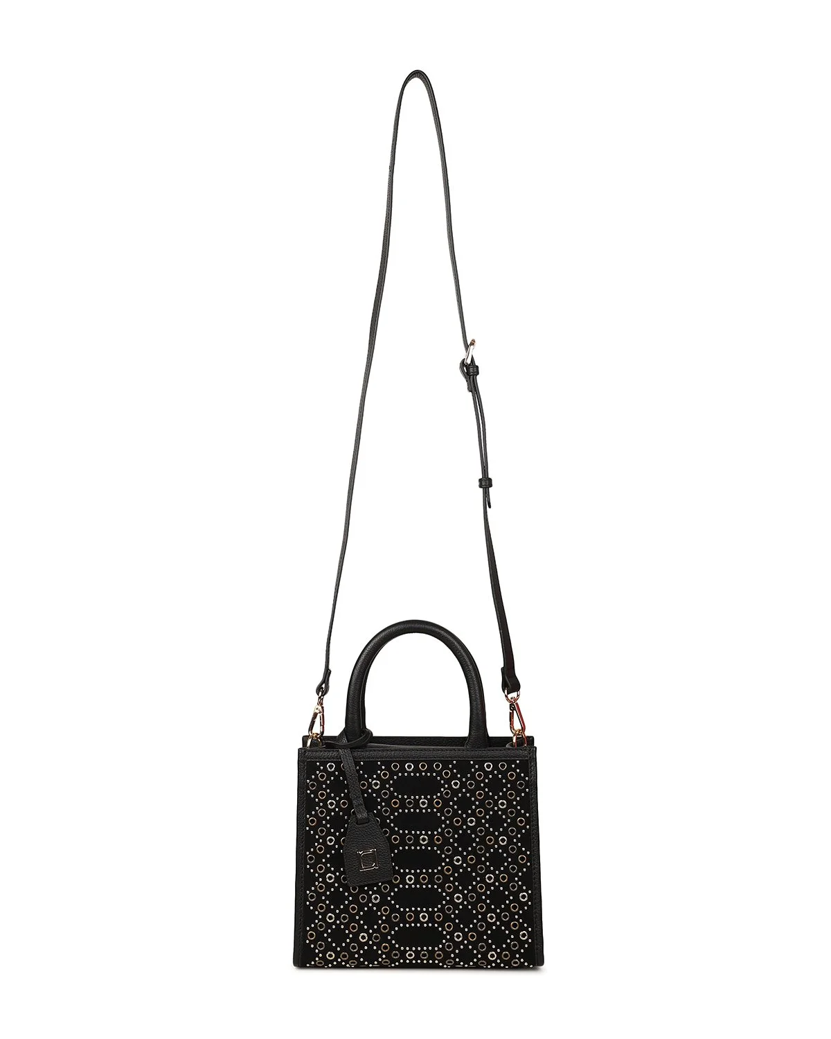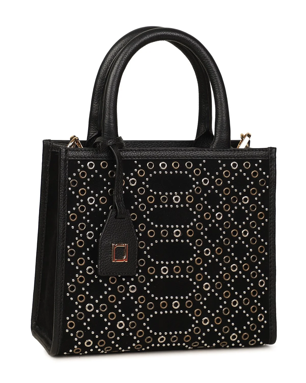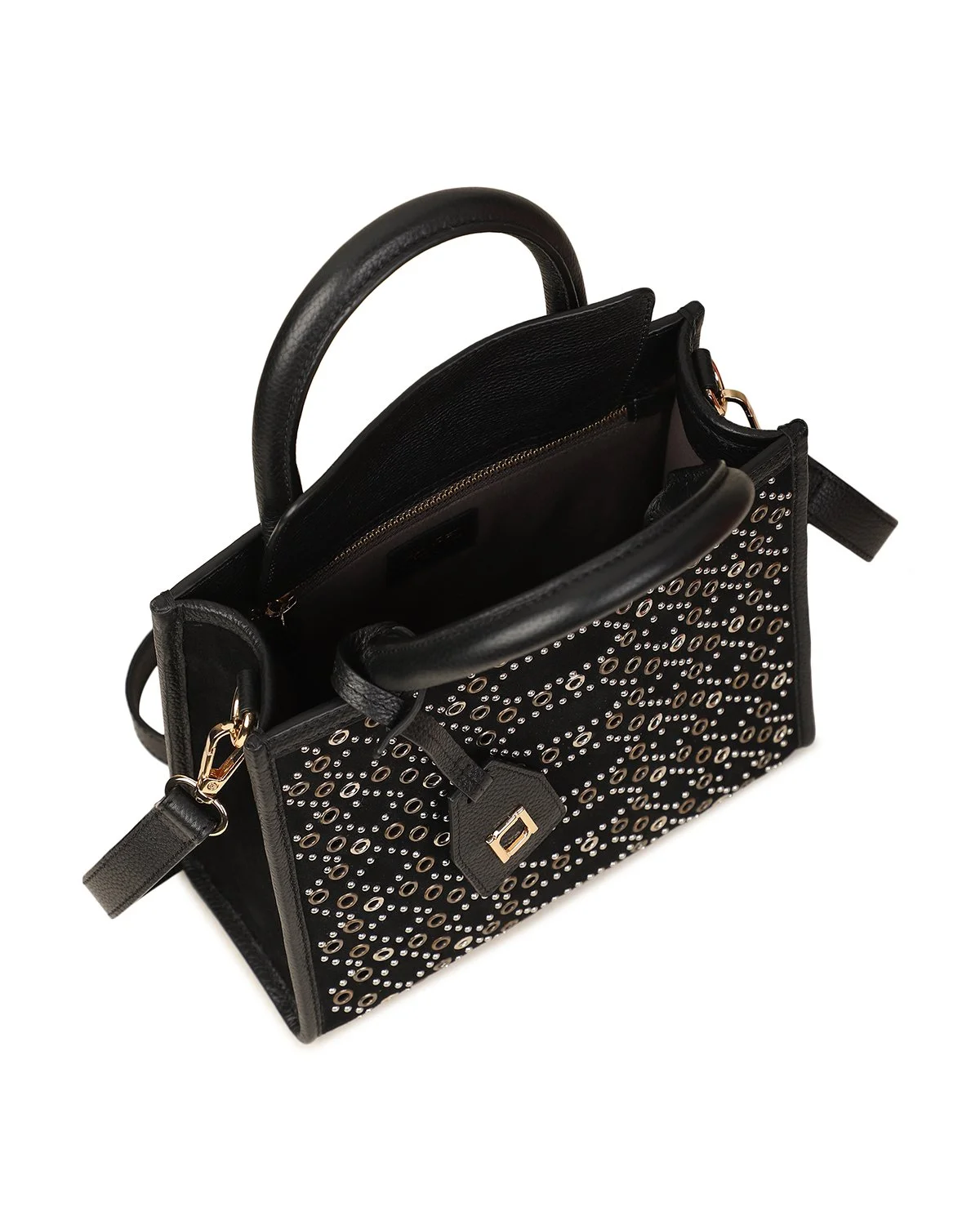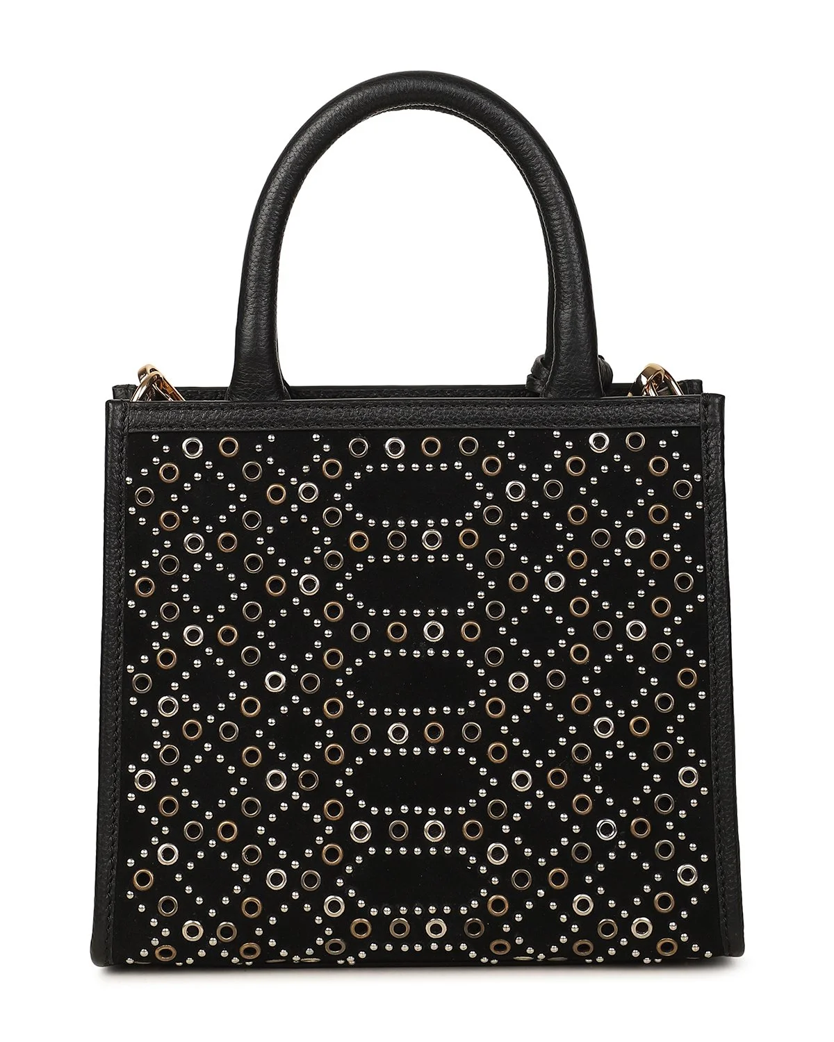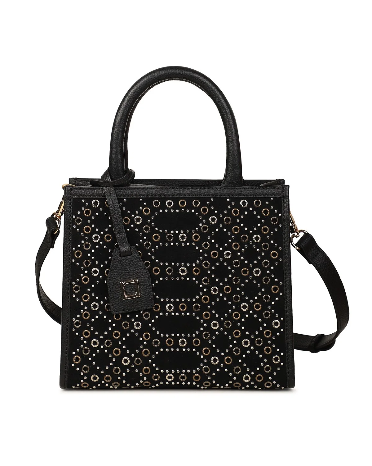 The AYESHA Small Tote Crossbody is crafted from black suede and leather, accented with gold and silver grommet embellishments for a modern, elevated edge. Compact yet versatile, it can be carried by the tubular top handles or worn hands-free with the removable shoulder strap.