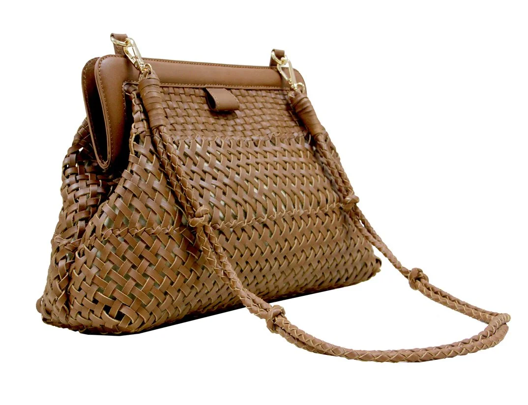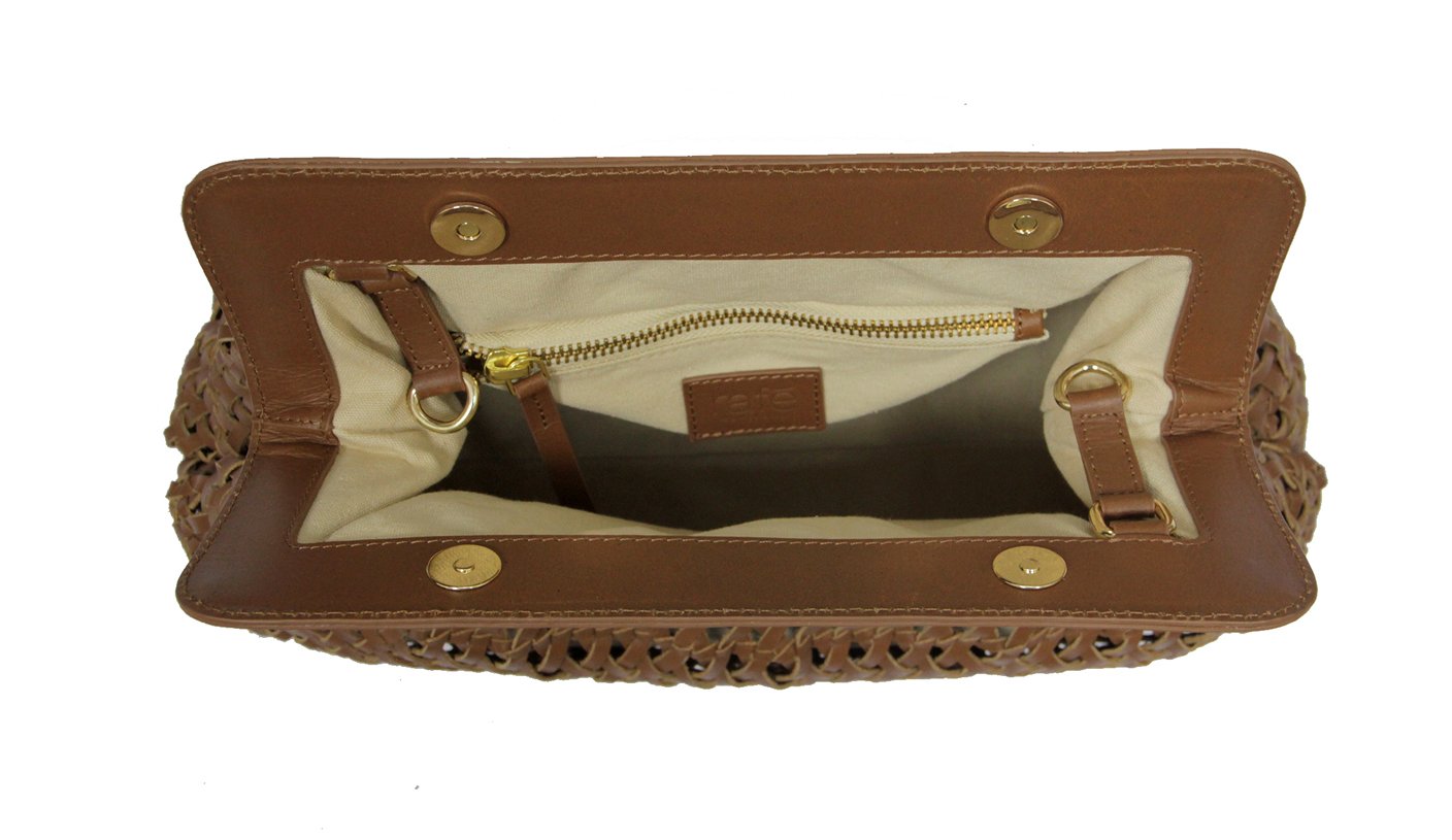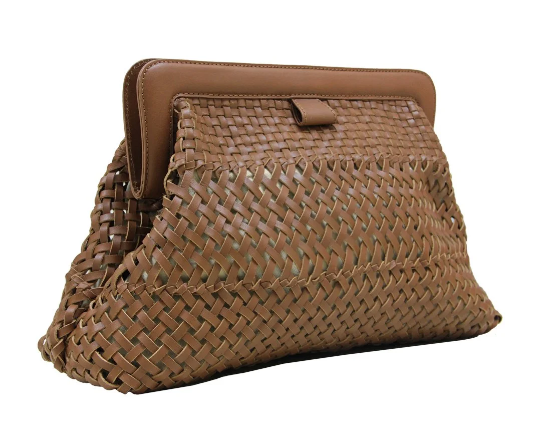 The FERNANDA Frame clutch is a timeless style crafted from hand-woven cognac leather and finished off with a covered frame with hidden double magnetic snaps. It is fully lined with an inside zipper pocket and comes with a woven leather detachable shoulder strap so you can wear the clutch cross body. The clutch can effortlessly store a day’s worth of essentials. It is the perfect day-to-night bag.
